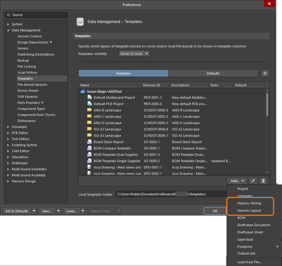 Select the File » Save As command from the main menus. In the Save As dialog that appears, browse to the local templates folder for your installation of Altium Designer (denoted in the Local Templates folder field at the bottom of the Data Management – Templates page of the Preferences dialog;