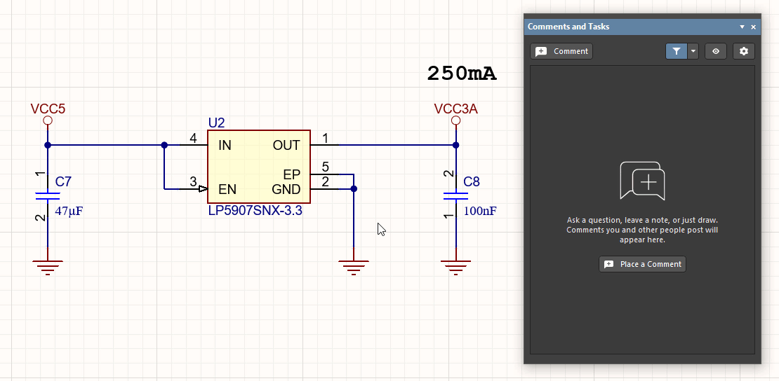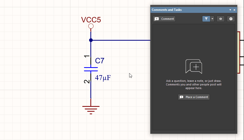 The Comments and Tasks panel allows you to add comments to a defined area or point in the active document of a Workspace project and assign these comments to Workspace members, essentially creating tasks for them. The panel allows all users who are working on the document to add comments and view all comments without actually modifying the document itself. This feature allows for the facilitation of strong collaboration processes and is invaluable when issues within the document need to be pointed out without physically merging and receiving conflicts. The Comments and Tasks panel can essentially be used to create a 'to-do' list, and as the design matures, the comments can be resolved and closed. Placed comments are available in real-time to collaborating users – those that have shared access to the document – and are saved to the Workspace independently of the project without altering its constituent documents in any way.