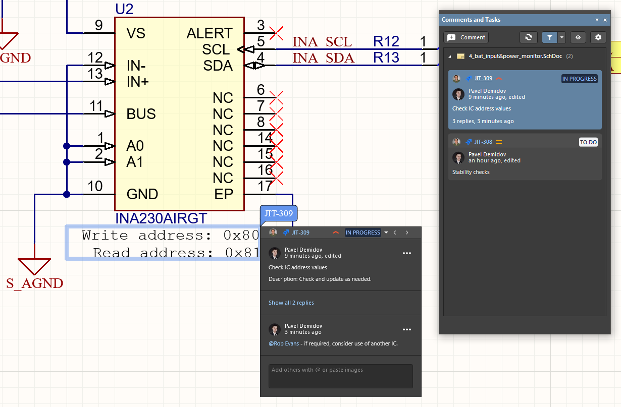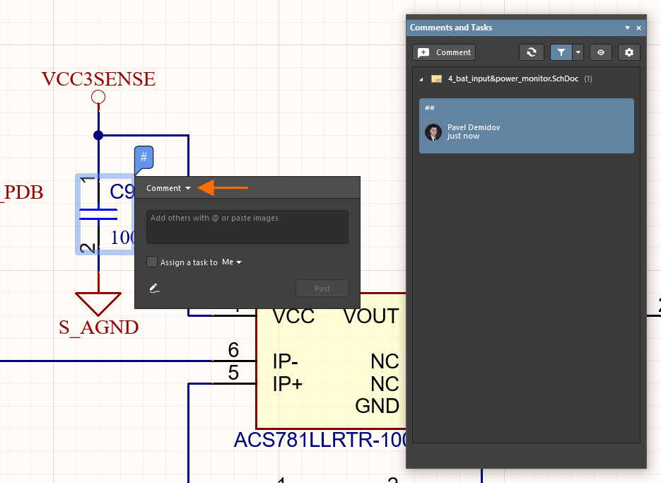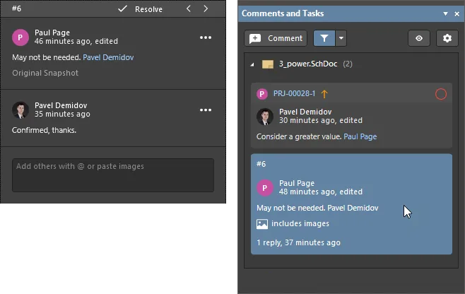 Note that comments and tasks can be added and managed in both Altium Designer and in the related Workspace via its browser interface design view. The functionality of the two commenting systems is essentially the same, and since both the project and commenting data are stored in the Workspace, the systems work together in real time.