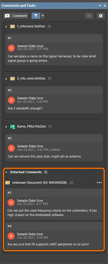 When a project document is removed, or its UniqueID has changed, the comments for the document can become "detached." Those comments can still be accessed from the panel's Detached Comments collapsible region. Click on a detached comment's tile in the Comments and Tasks panel to show its dialog in the design space of the currently opened document.