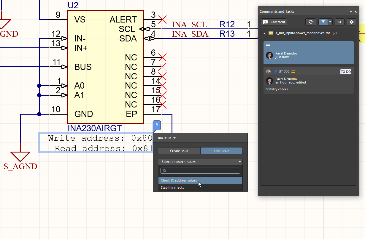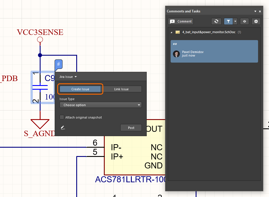If Jira Integration is enabled and configured for your Altium 365 Workspace, then a placed comment will include the additional option of placing and linking with a Jira issue in your Atlassian Jira® service. Like conventional comments and their associated tasks, placed Jira issues can be viewed, edited, and commented on from within the design documents, and viewed/selected via the Comments and Tasks panel.