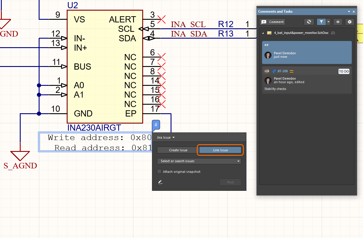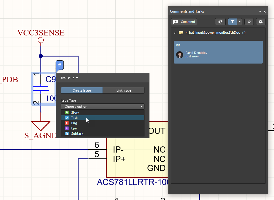 Altium 365 Jira Integration also allows a Workspace Task to be linked to an existing Jira issue in your Atlassian Jira service through the comment dialog’s Jira Issue mode. You can link to any issue in the specified Jira project, which is then synchronized with the Workspace Jira task.