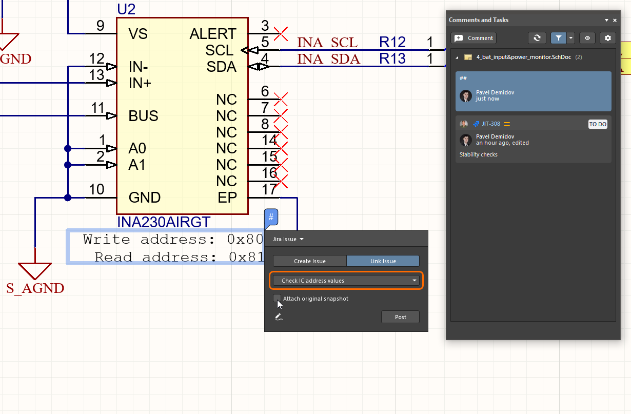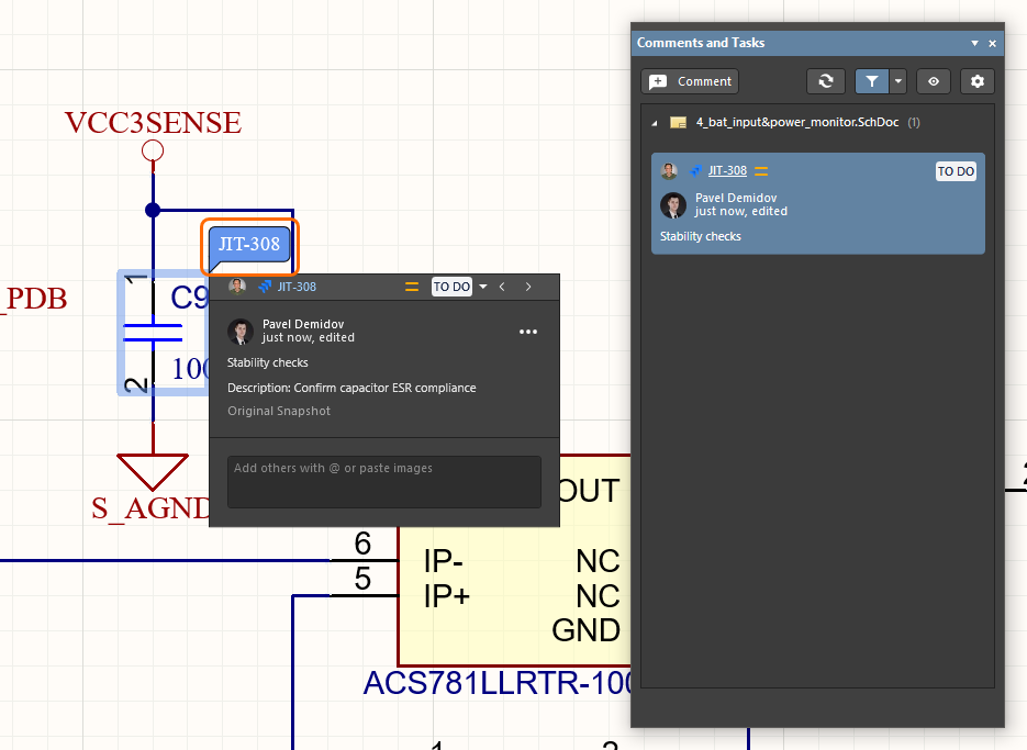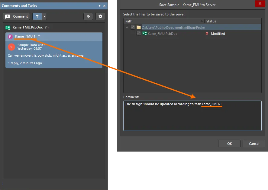 Commit tags and release revision IDs are displayed when viewing the applicable comments/tasks in both the Comments and Tasks panel and the commenting dialog in Altium Designer.