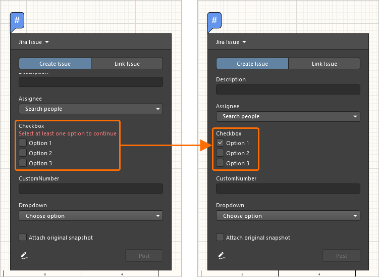 The dialog’s Jira Issue drop-down will show the selected issue from the Jira space. If required, check the Attach original snapshot option to transfer an image of the current document view to Jira.