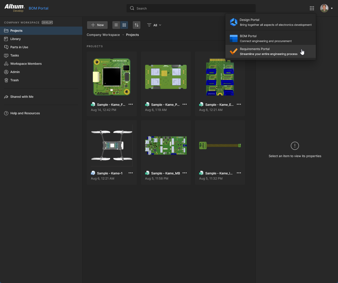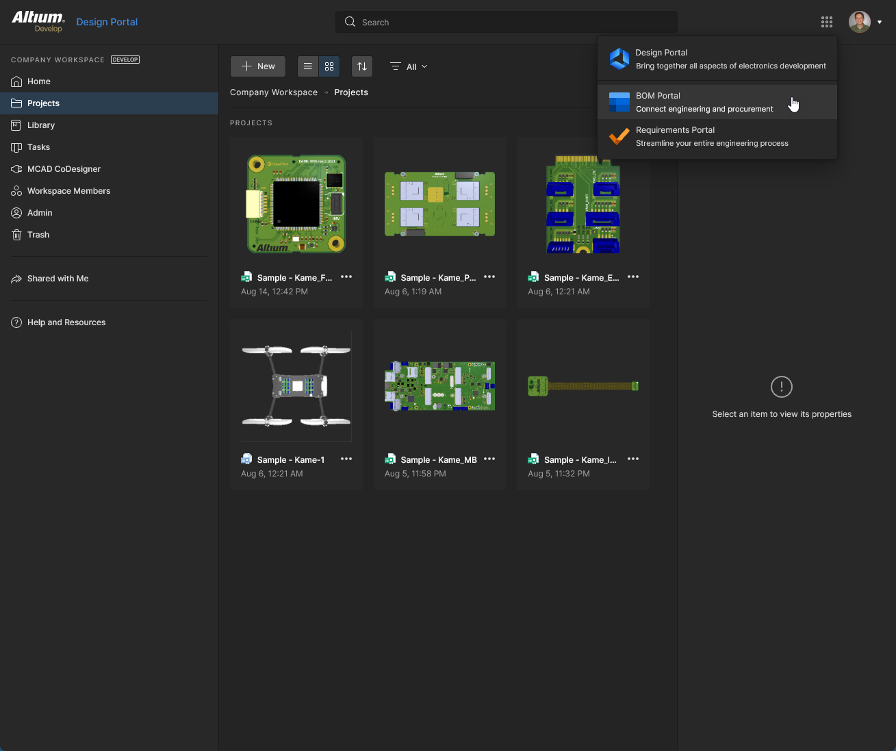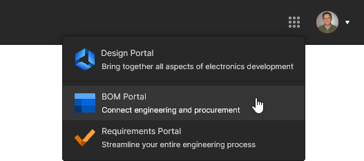 This page is the starting point for using the design and management tools available to the Workspace. Each tile provides direct access to application portals within the Workspace environment, or in the case of Altium Designer and MCAD CoDesigner, access to their installation – see Installing Altium Designer Develop and Installing Altium Designer Agile. Also provided is a standard ‘9-dots’ menu (