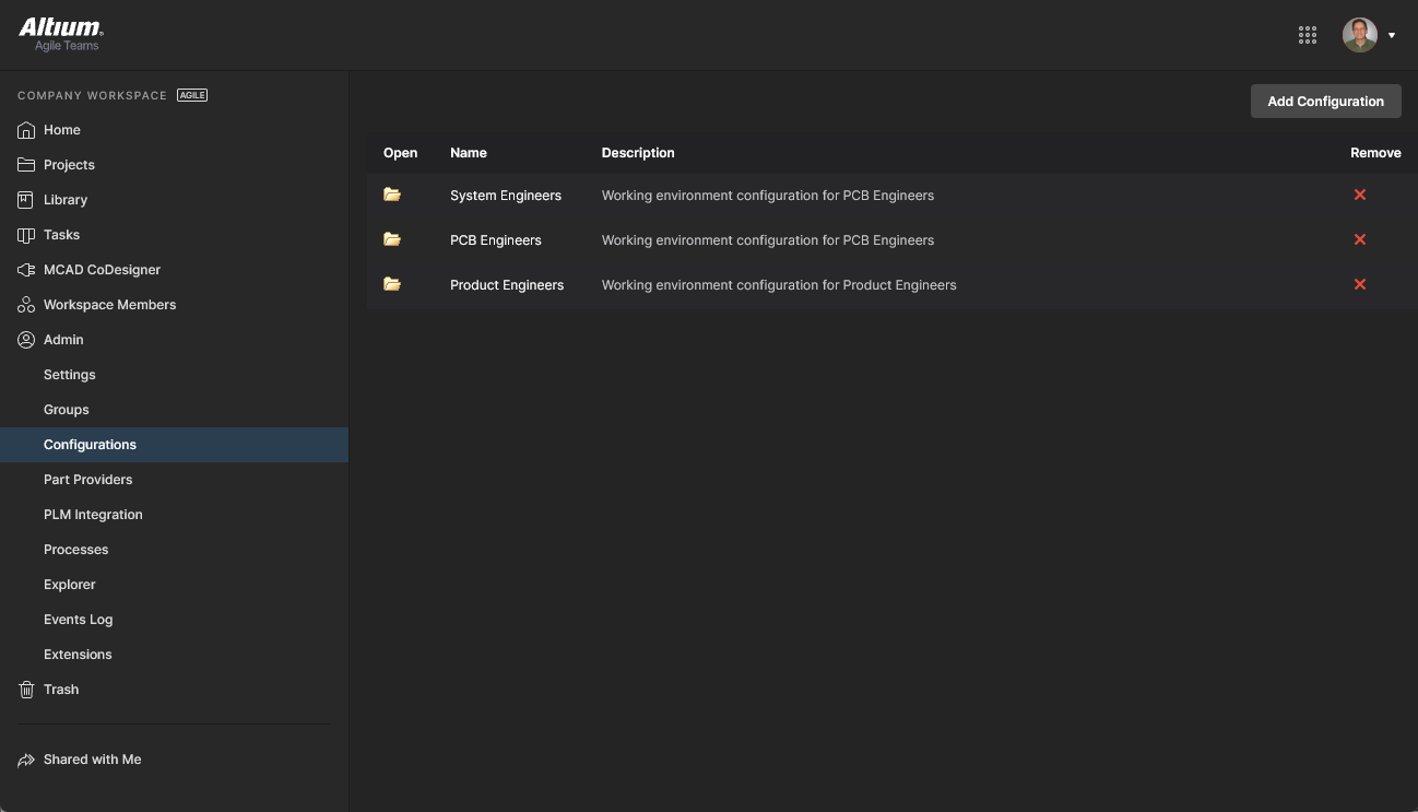 The Configurations page provides the means to formalize the working environment for Workspace members based on their assigned Group. In practice, configuration instances are used to constrain each designer's Altium Designer working environment to use only company-ratified design elements, including templates, output job configuration files, workspace preferences and more. Any number of Configurations may be created and assigned to user Groups (Roles) as required.