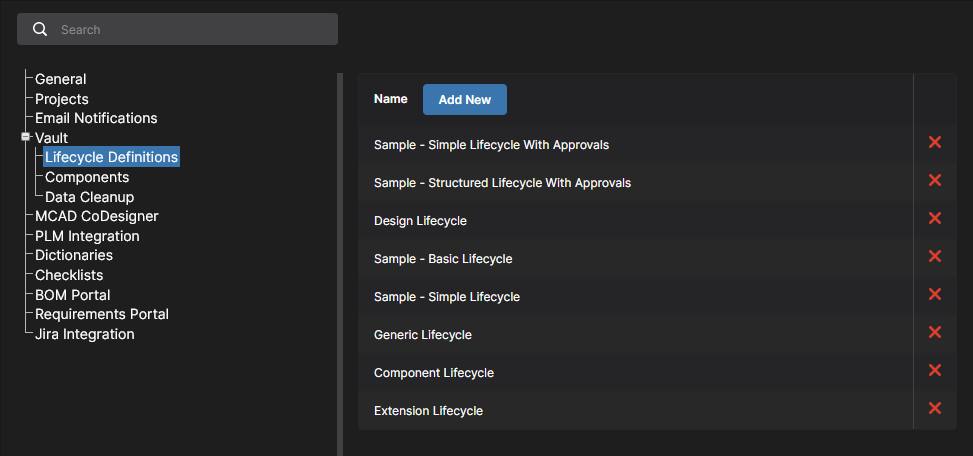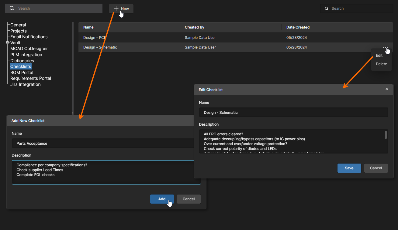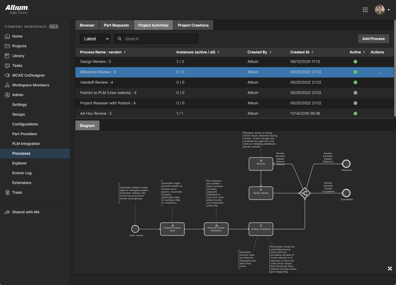 This page provides the interface to create and manage Process Workflows that formally guide a company's designers through typical, everyday design processes such as: