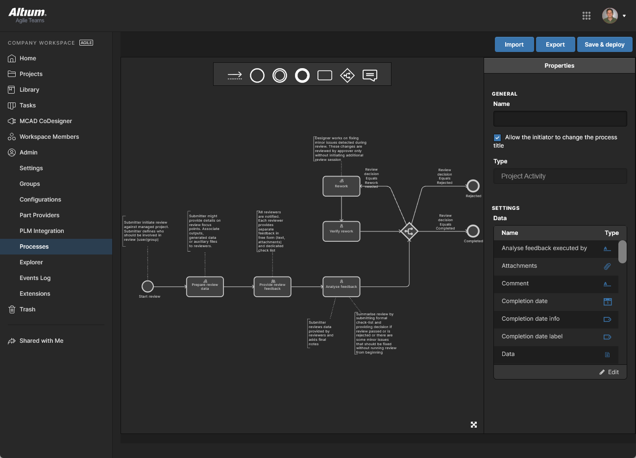 Each Workflow that is used to implement a particular design process is created as part of a Process Definition. It can therefore be referred to as that process's underlying Workflow, or simply a Process Workflow. Processes and their Workflows are created and managed through the Processes page interface, where a range of predefined processes can be enabled for use or cloned and modified to suit your needs using the included Process Workflow Editor.