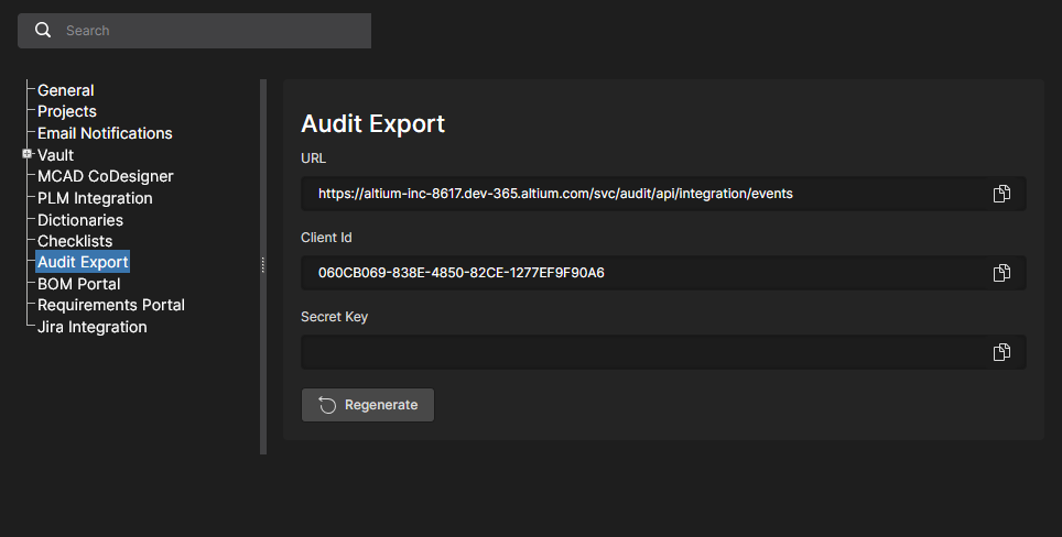 The Altium 365 Workspace provides an API for transferring Events Log data to a suitable SIEM (Security Information and Event Management) system for compliance and auditing purposes. Note that the Altium 365 SIEM API is available when the Altium Organizational Security Package has been purchased and enabled for your Workspace. See the Audit Export entry above for more information.