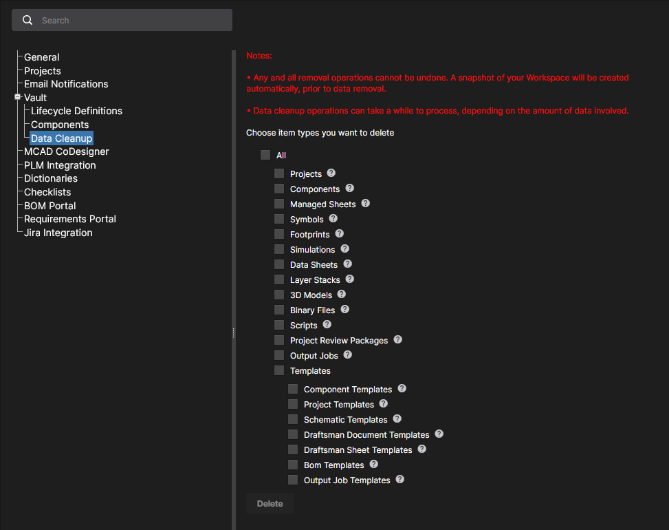 When browsing a specific component, you can also delete that component (provided you have editing rights). The action is actually a 'soft delete', whereby the component will be moved into the Trash area of the Workspace. You can also opt to delete the component's related items (e.g. symbol, footprint model(s), simulation model, datasheet). Note that these can only be deleted if they are not being used elsewhere (by one or more other components). A component can be restored or permanently deleted from the Trash page. Permanent deletion is only possible provided it is not being used on a managed schematic sheet, or within a design.
