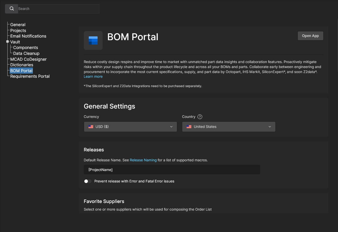 Favorite Suppliers: Specify the default parts vendors that are enabled for Managed BOM documents. See the BOM Portal’s Order List section for more information. Note that the available suppliers included in the Favorite Suppliers list are in turn defined by the Altium Parts Provider settings in the Workspace Part Providers page.