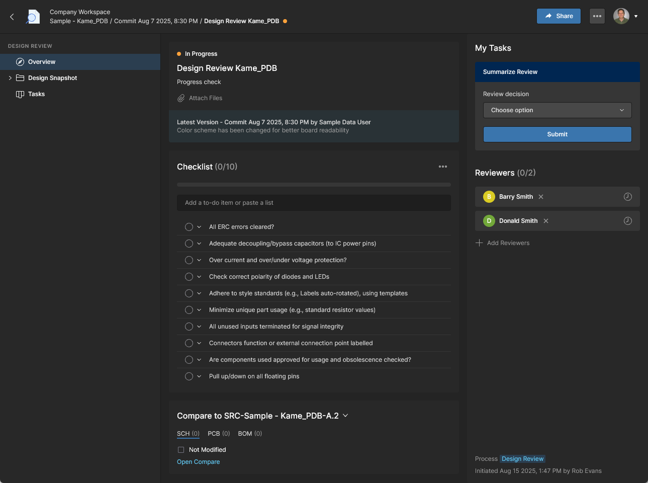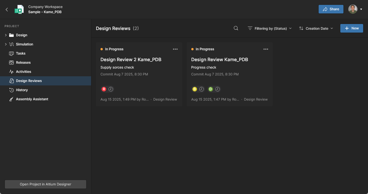 Design Reviews – view and access a tiled listing of the project’s Design Review processes with an In Progress status (by Default), or by clearing the status Filter, also those that have been Rejected or Cancelled. Created and managed through a dedicated user interface, Design Reviews are a configurable peer-review process that includes design content snapshots, definable Checklists, Reviewer user assignments, and design change comparisons.