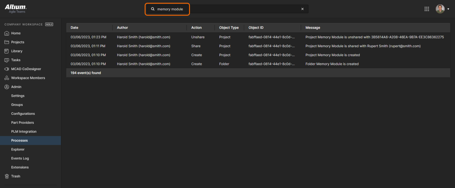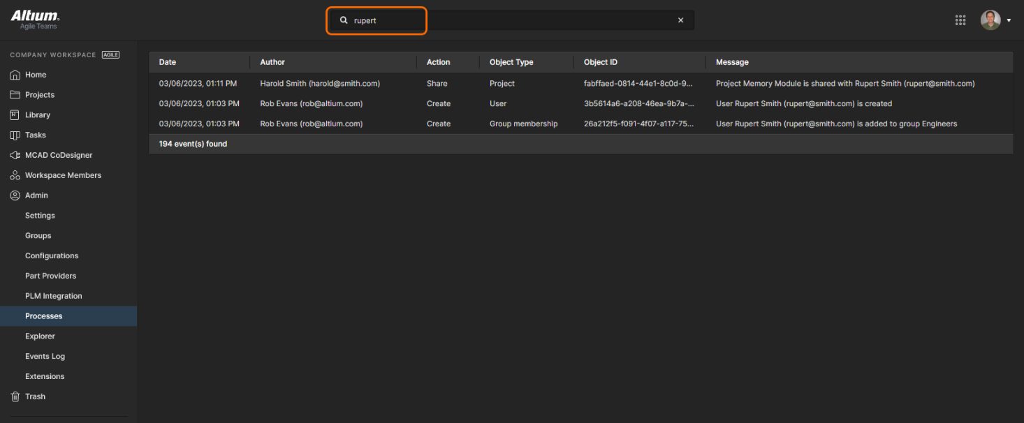 The Events Log is a sequential list of notable Data and User events that have occurred in the Workspace. It provides a single point of access for administrators to monitor and audit key Workspace activity for data governance purposes. This option is available to administrators when the Altium 365 Organizational Security Package is enabled for your organization.