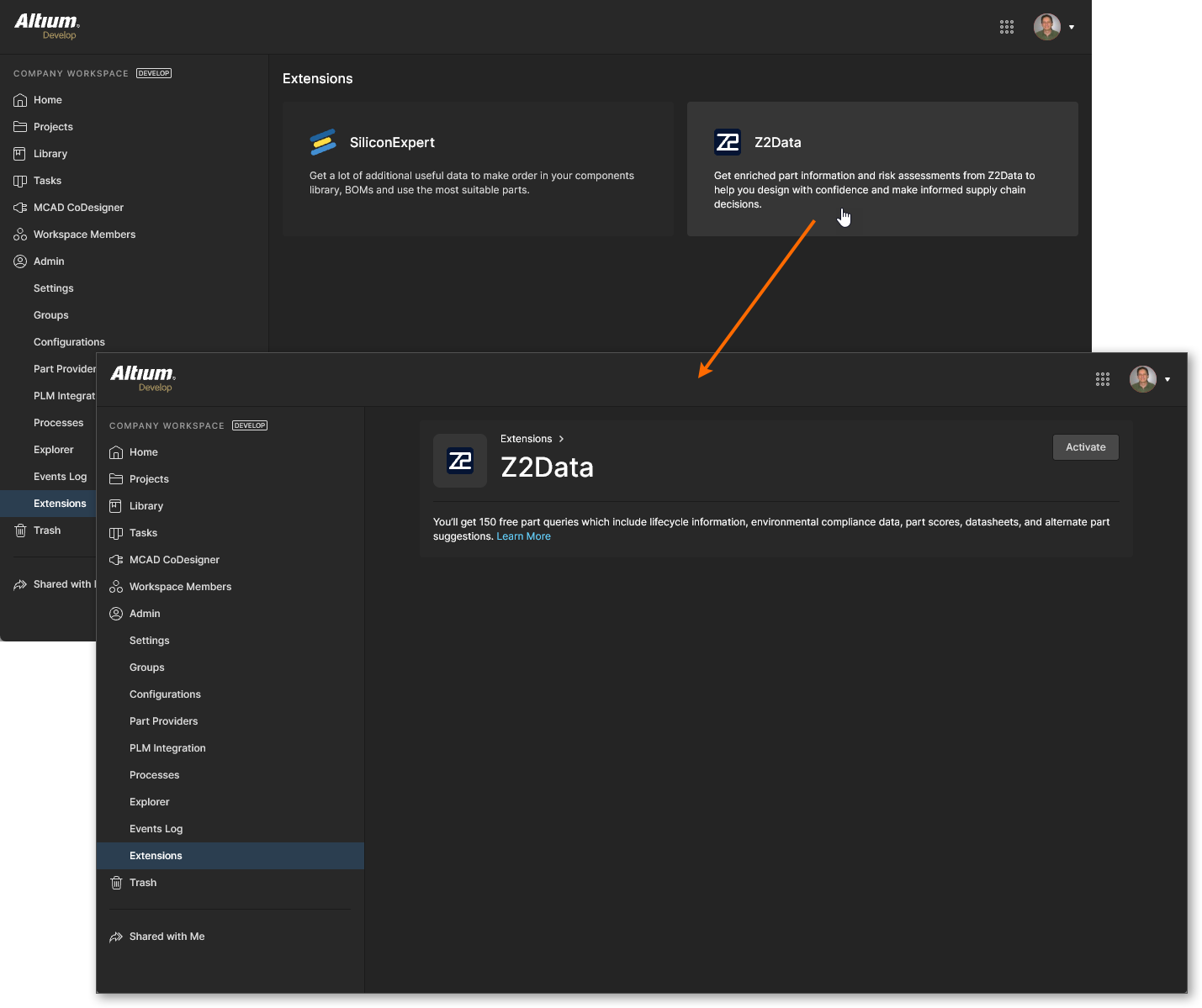 A Z2Data application tile is included in the Admin – Extensions page when Z2Data Integration is enabled for your Altium 365 Workspace. Select the tile to open the Z2Data application and then the