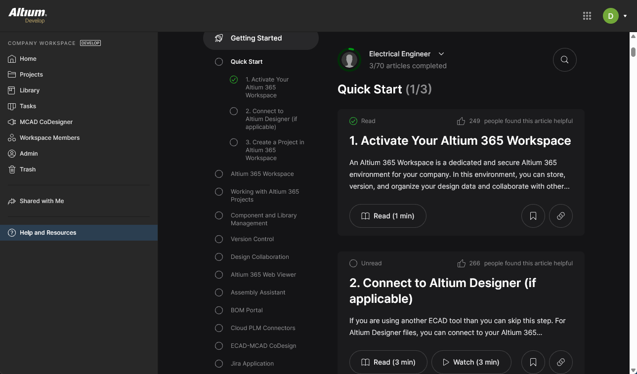 As a new Workspace member you are invited to nominate a working role that best fits your needs, which once selected, will open the current Altium Workspace Getting Started guide within the browser interface.