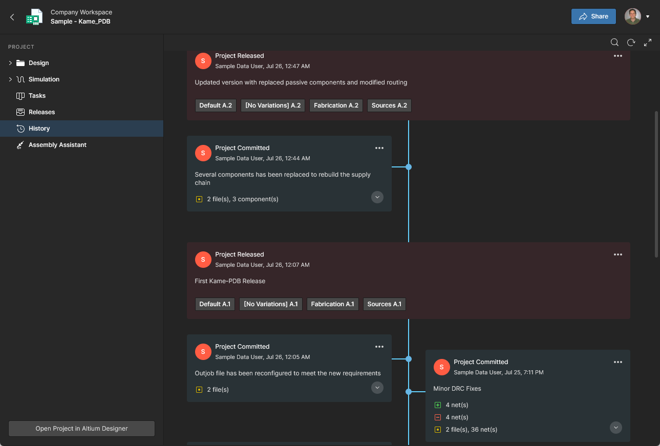 History – browse a progressive timeline of major events relating to the project, including its creation, commits, releases, clones and MCAD exchanges. Each time a supported event happens in association with the project, that event is added to the timeline as a dedicated tile with various actions supported where applicable. You also have the ability to compare Schematic, PCB and BOM data between releases and commits, and compare Gerber data between releases or against a locally generated file set. See Project History and Design Data Comparisons for more information.