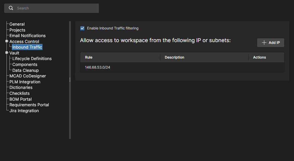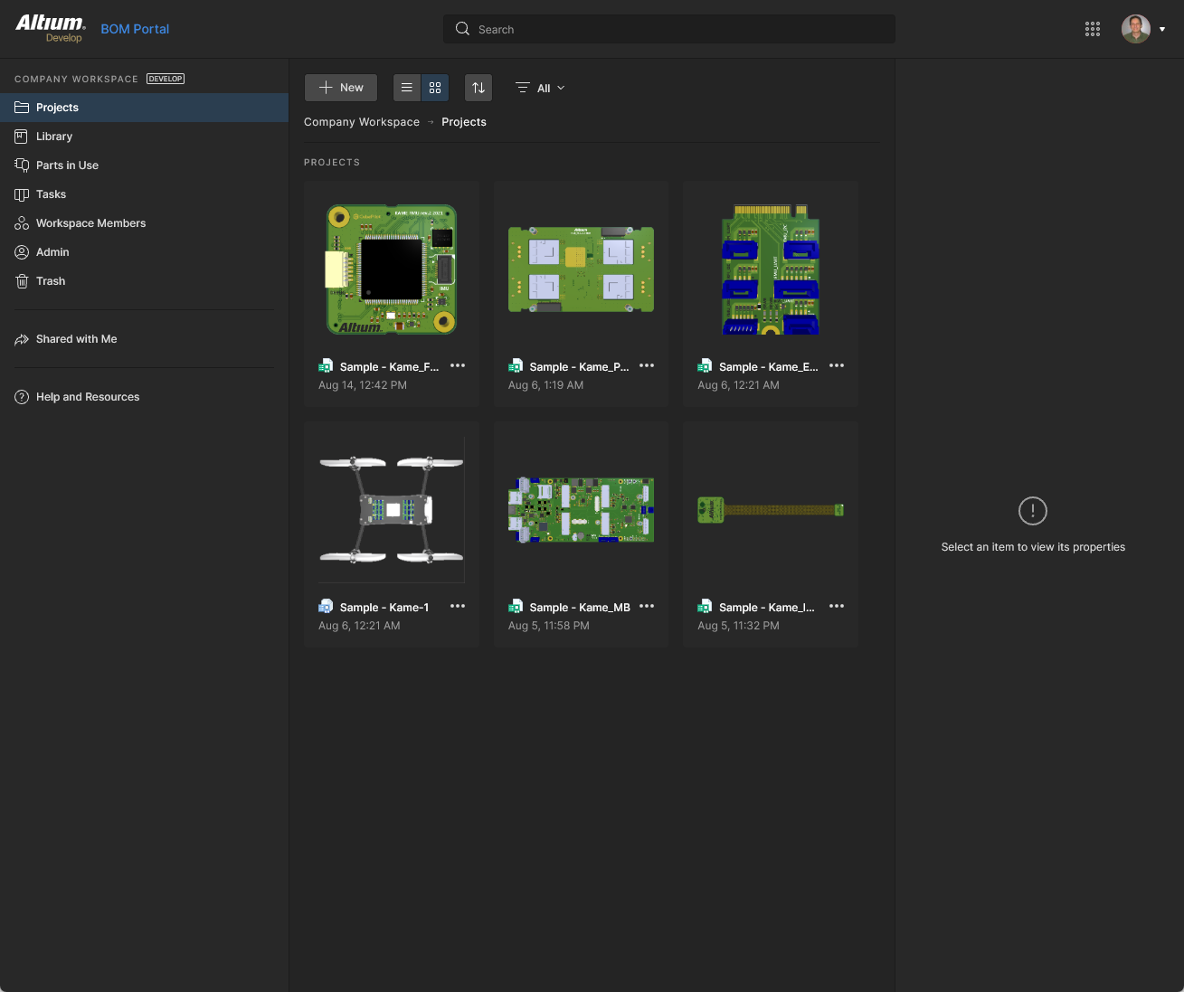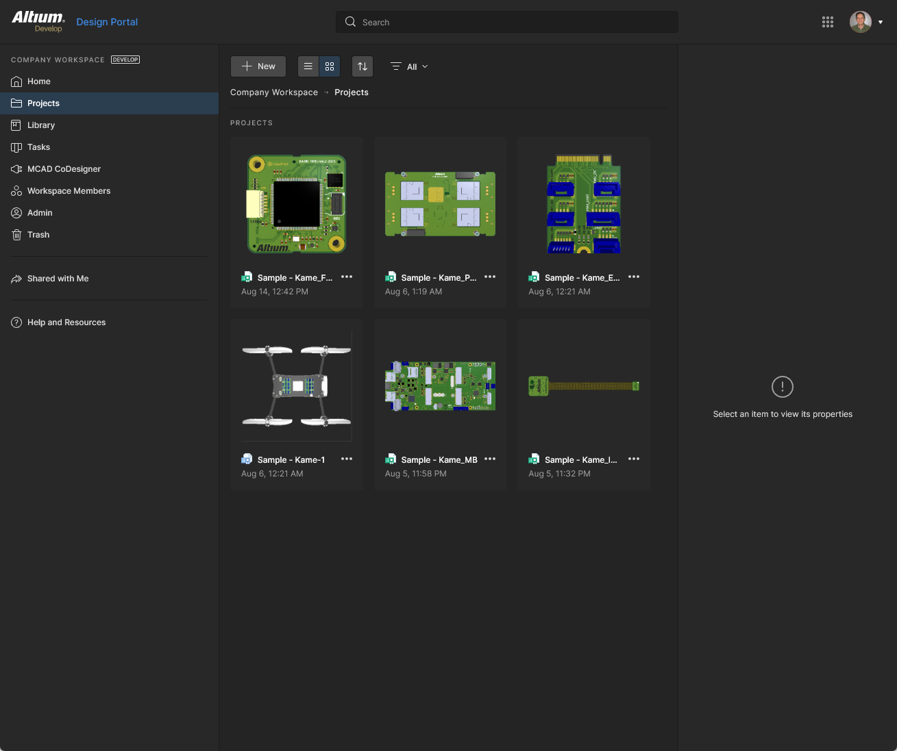 This page provides the interface to the Projects service and is effectively the Workspace Design Portal. It provides a central, CAD-centric location to create, upload and manage projects, and also share them (by setting access permissions) for team collaboration as required. The page lists all Workspace design projects, which target the development stage of the project lifecycle, simplifying the creation and ongoing workflow for version-controlled projects.