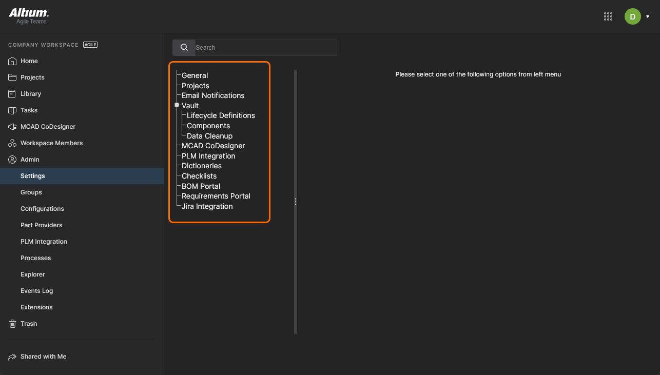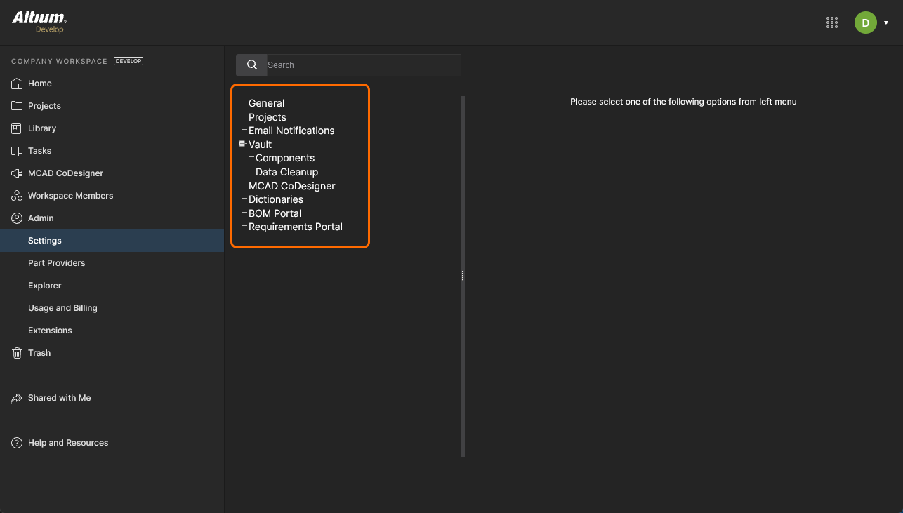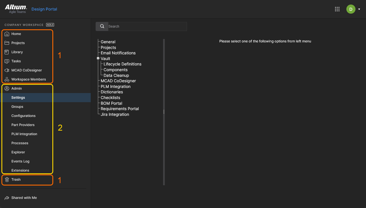 Within the Altium 365 Platform Interface, the area for the active Workspace provides a number of key technologies and services and can be coarsely divided into two groupings, as shown in the following image and listed thereafter.