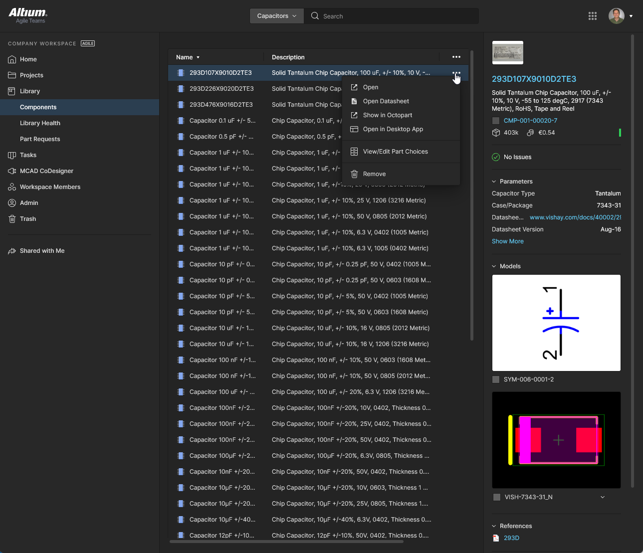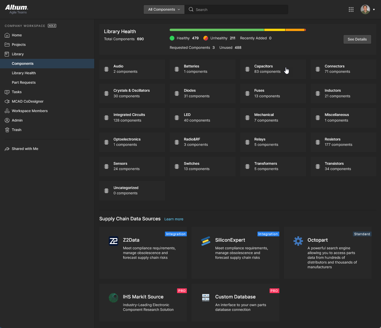 This page, accessed by selecting Library navigation entry or its Components sub-entry, provides access for browsing all components that are currently stored within the Workspace. You can quickly see which (and how many) components you currently have at your disposal and gain detailed information about each part. Components are grouped into type category tiles that can be opened individually to access all parts of that type. In turn, Part Choices can be managed for each component part and further information accessed from provided datasheets and available supply chain data sources.