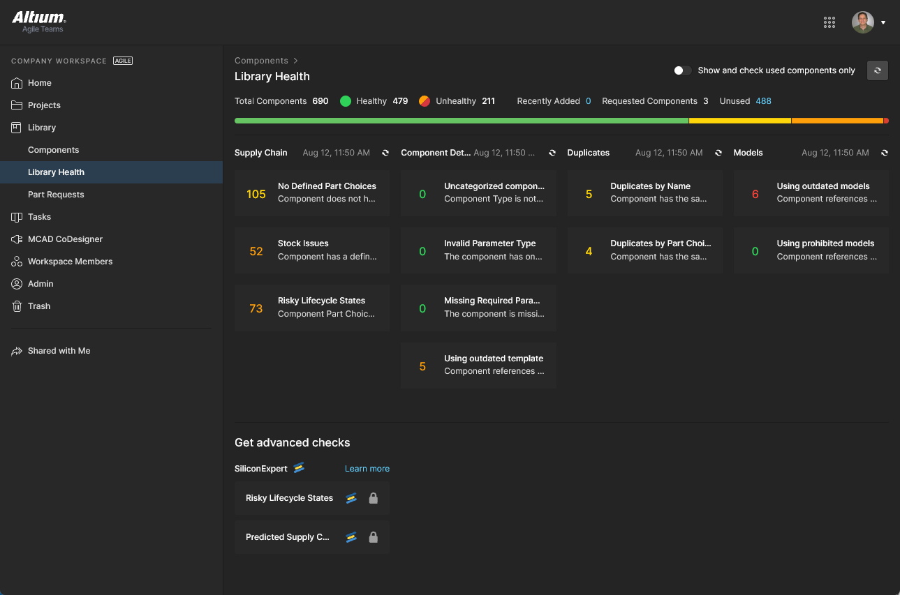 This page provides a direct link to the detailed Library Health dashboard page, from where you can run health checks and inspect component health issues in detail. The analysis results are grouped into Themes – types of component health issues – that can be opened for further investigation and resolution. Parts can be opened for viewing, deleted, excluded from the analysis, filtered by only those used, and more.