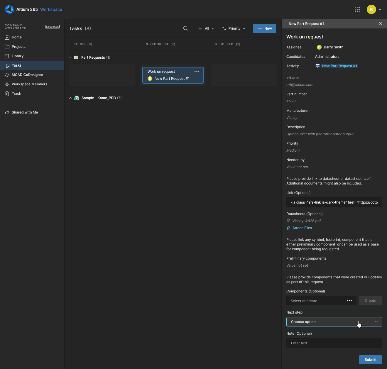 Part Requests are defined by a Process Workflow and progressed to completion (Resolved) by the assigned user through the Tasks page – the details and command options are accessed from the Task Details pane.