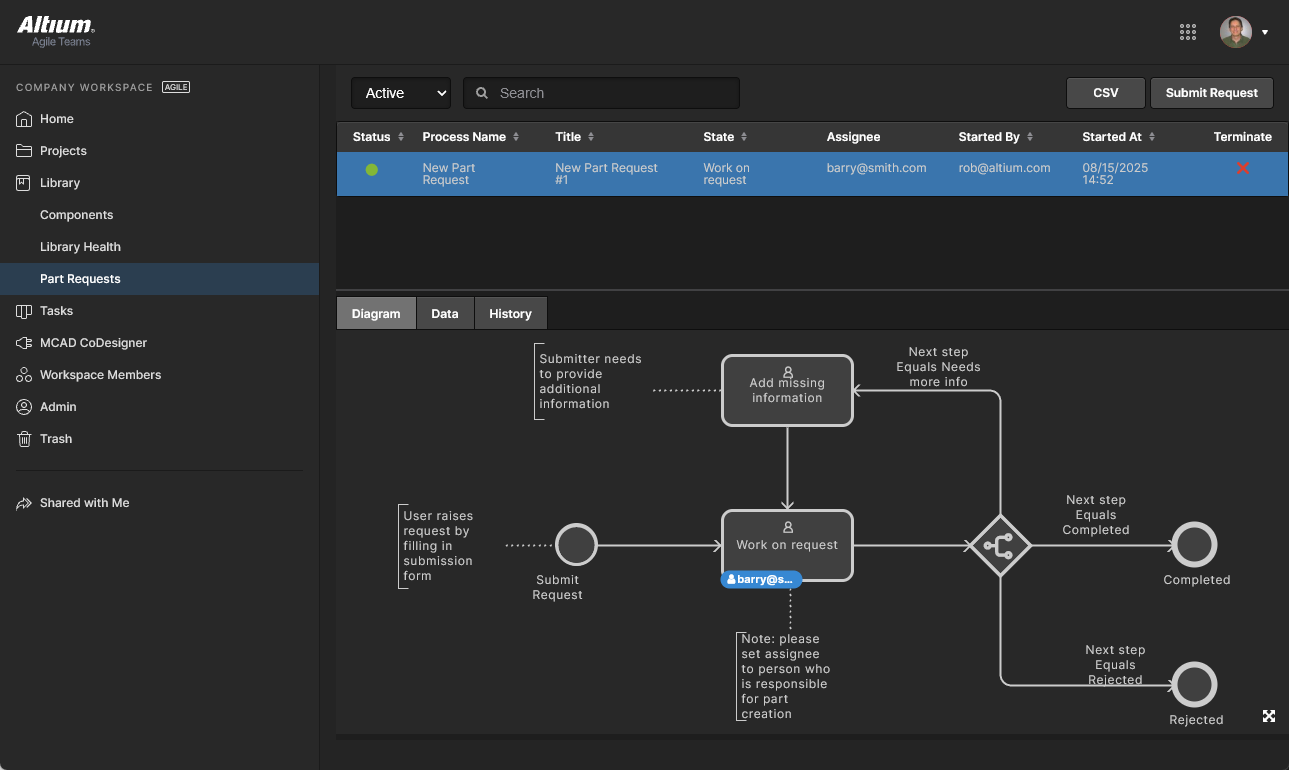 The Part Requests page lists Active or Closed request processes, with tab options that provides an active workflow view (Diagram), a table of all submitted request information (Data), and a sequential list of process workflow events (History).