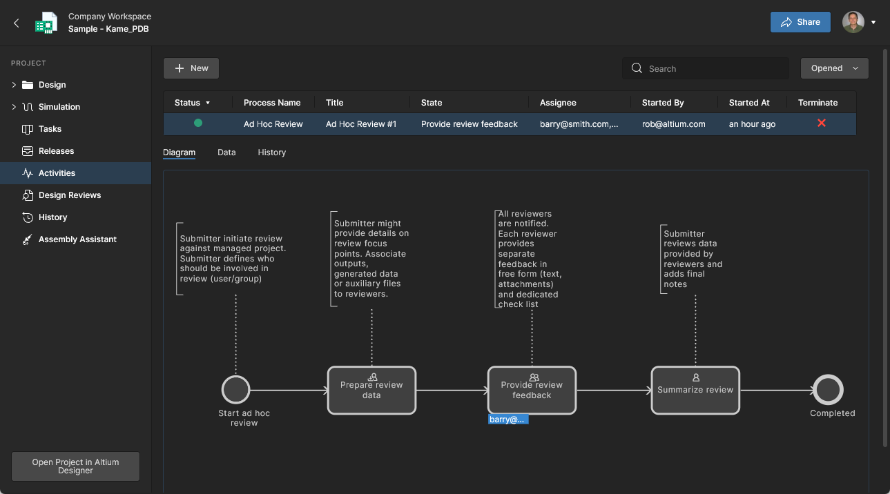 Active reviews are accessed and approved/rejected by the assigned Reviewer through an opened Design Review instance or via Tasks page, and then ultimately moved to completion by the review Initiator (creator). See detailed information on the Design Reviews page.