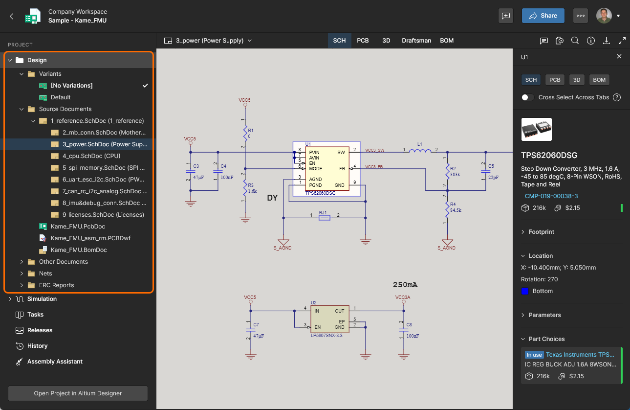 Design – display and navigate source project design documents, view design object properties and place review comments. This view uses the Web Viewer interface to present your design across five distinct data sub-views, to show the source schematic(s), board in 2D, board in 3D, Draftsman document and Bill of Materials, respectively. This view is for the latest version of the source project data, rather than a specified release from that project, and so could be considered to be a work-in-progress (WIP) view. You can review both the base design and any of its defined variants.
