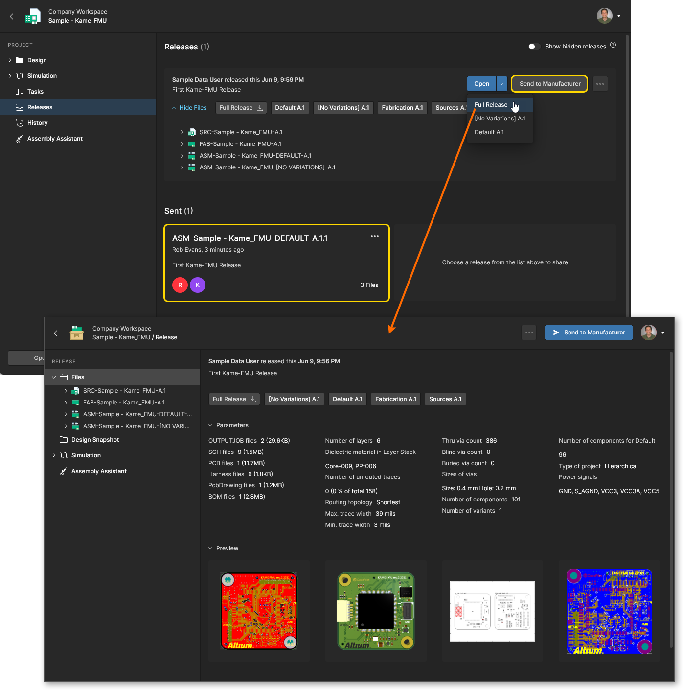 Releases – view the releases for the project. Access is provided for opening the full release data or a specific assembly package, which will be presented on a separate tab through a Manufacturing Portal. From this portal you can view and navigate the released file data, inspect the BOM, and view and comment on the snapshot of the design itself; the source for that released data. From either the Releases view or through the Manufacturing Portal for a specific release, you'll have access to controls for downloading manufacturing data at various levels of granularity (from full data set(s) to individual generated output files). A chosen release can also be sent – as a Manufacturing Package – directly to your manufacturer. You also have the ability to compare Gerber data between releases or against a locally-generated file set, and compare Schematic data, PCB data or BOM data between releases.