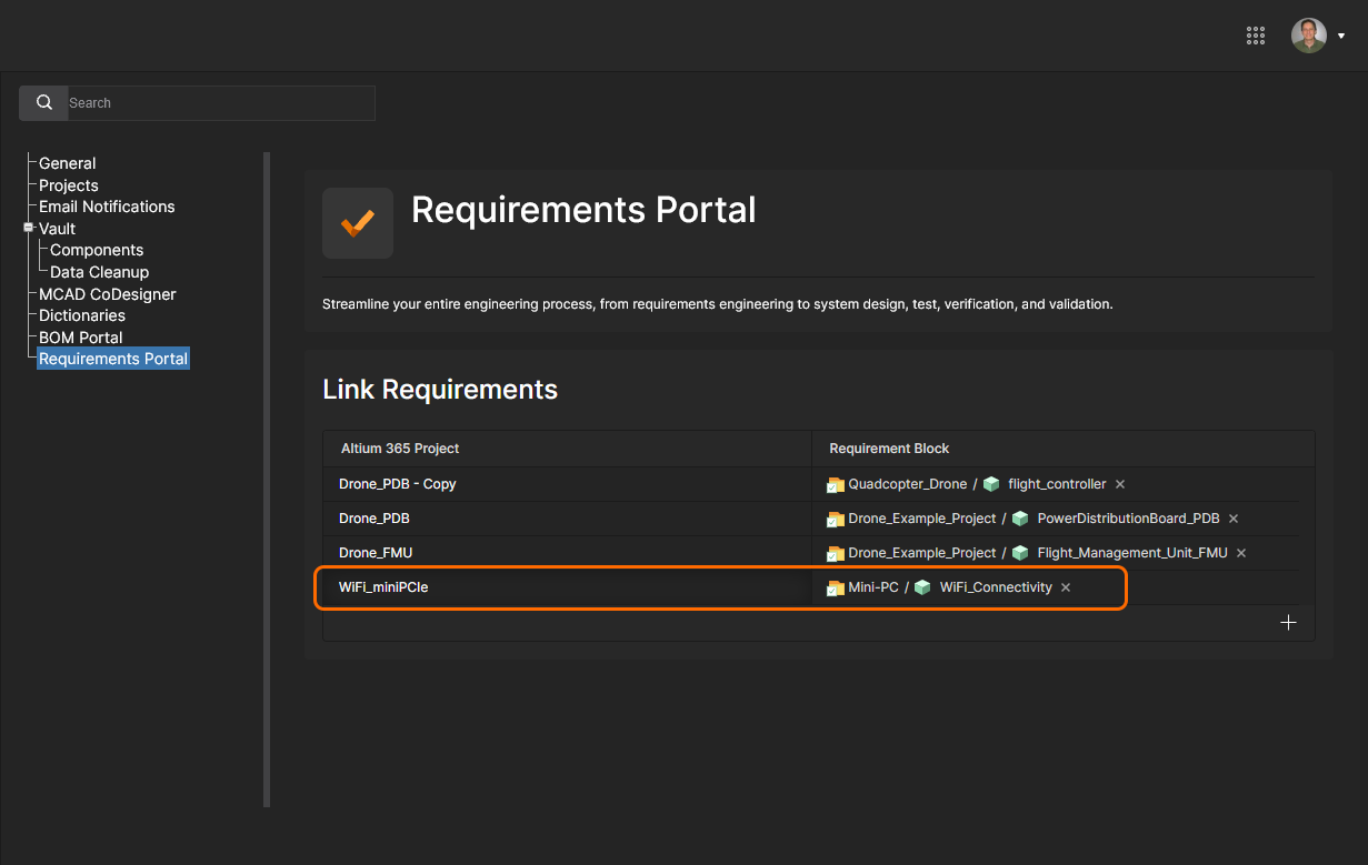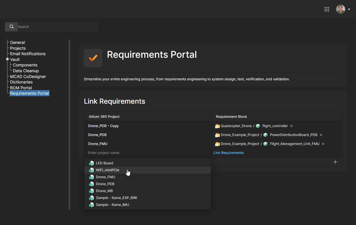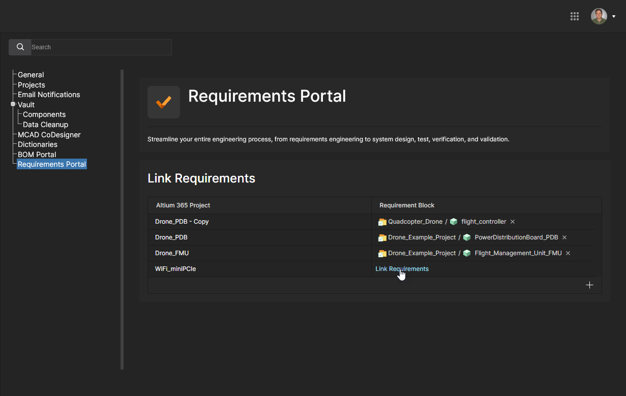 Requirements Portal is an advanced system engineering application that integrates with Altium 365 to define and manage technical requirements for project designs. Requirements instances created in the portal can be placed in Altium 365 Workspace design documents and also assigned as user Tasks. Compliance with a Requirement definition can then be verified within the project design space, the status of which is synchronously reflected in the Requirement instance in Requirements Portal.