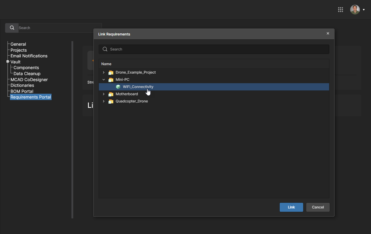 The synchronous link between your Altium 365 Workspace and Requirements Portal is defined by mapping a Workspace project to a portal’s System Design Block that has associated Requirement definitions. The link can be established in different locations:
