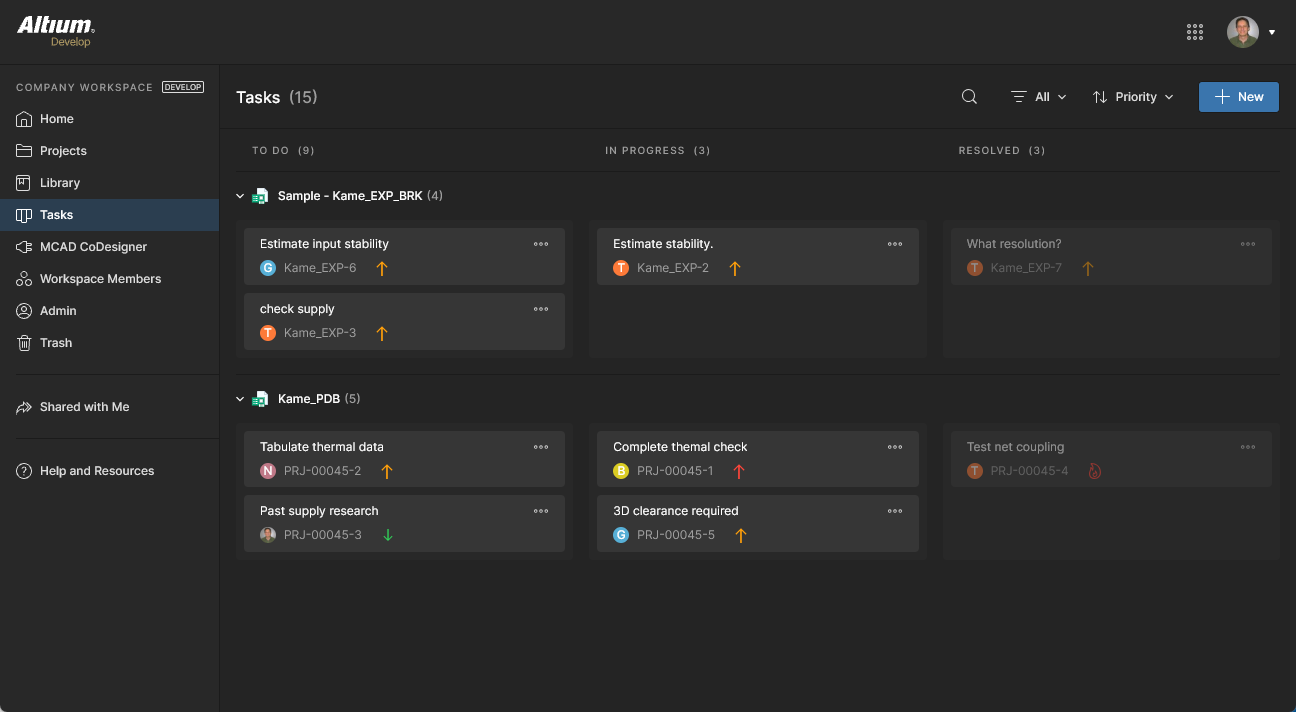 Although presented through a relatively simple interface, the Workspace Tasks dashboard offers a flexible and efficient way of both managing and tracking workflows within the actual design environment rather than via an external system. This page is a global view of all Tasks that are currently active in the Workspace, while the project-specific Tasks view available from the navigation tree when viewing a project represents only those Tasks associated with that project.