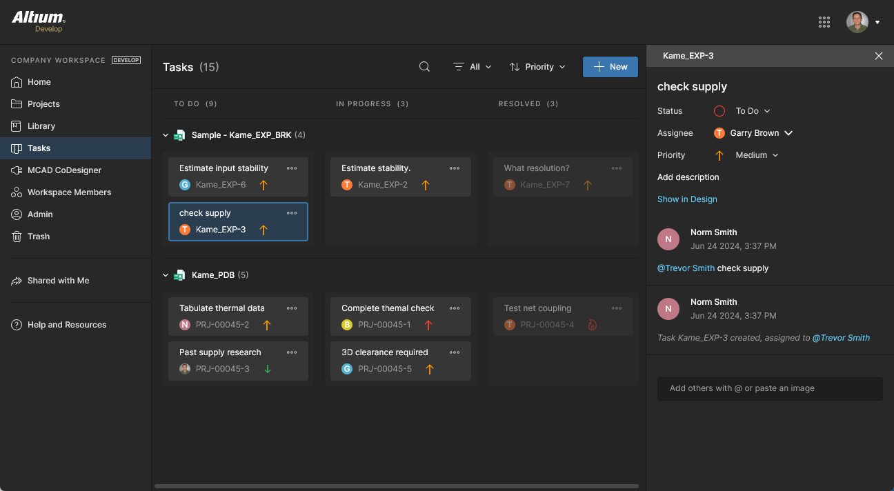 This page view allows you to access and manage all Tasks – job activity requests – that are currently active in the Altium 365 Workspace. Tasks are presented in a Kanban board flow style, with their progress state (ToDo, InProgress and Resolved) moving through Task rows. One row is reserved for general Tasks (those not associated with a project), and each remaining row applies to Tasks for a specific project. General Tasks are created from within the dashboard, and Project-specific Tasks are created by assigning a Workspace member to a project Comment.
