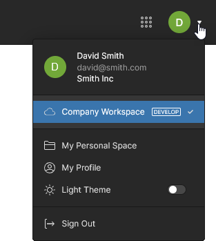 If you have access to multiple Workspaces, this menu also allows you to switch between them.
