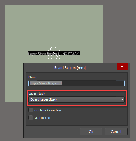 From here, you should be able to select the Board region. Double-click the board region to open the Board Region properties, and then select the Layer Stack Drop-down, make sure it is set to a Board Layer Stack.