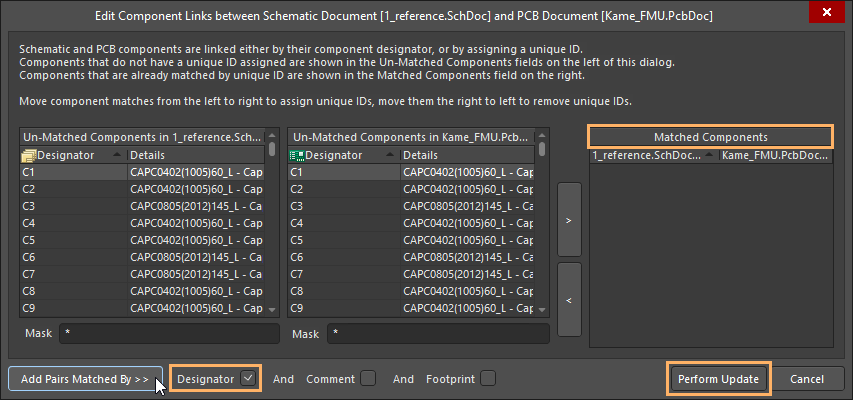 Match all components by their designators by ensuring that the 'Designator' checkbox is enabled at the bottom of the dialog and then clicking the 'Add Pairs Matched By >>' button so that all components are then displayed in the Matched Components List followed by clicking the 'Perform Update' button.