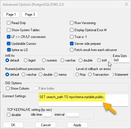 2. For example, add the following to your connection settings: SET search_path To myschema,public;