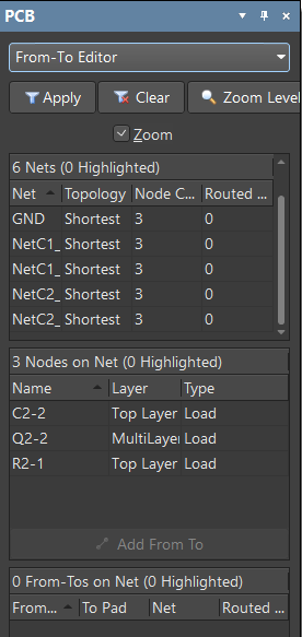 If you've tried everything above, and your connections lines still are not visible there is one other thing to check. Open your PCB Panel and verify that the pulldown option at the top of this panel is *not* set to From-to editor. If the PCB Panel is in this mode, it can only display connection lines for the from-to you are viewing or editing.