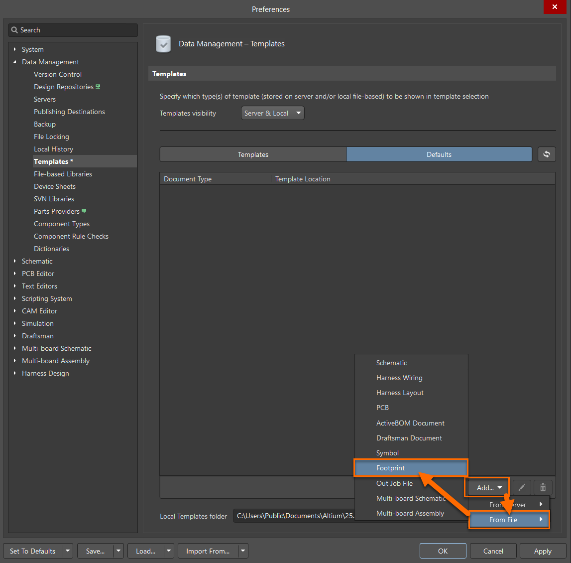 For that, go to Preferences » Data Management » Templates » [Defaults] » [Add...] and use the option From Server » Footprint. This will automatically open the Explorer panel showing the available footprint template(s).