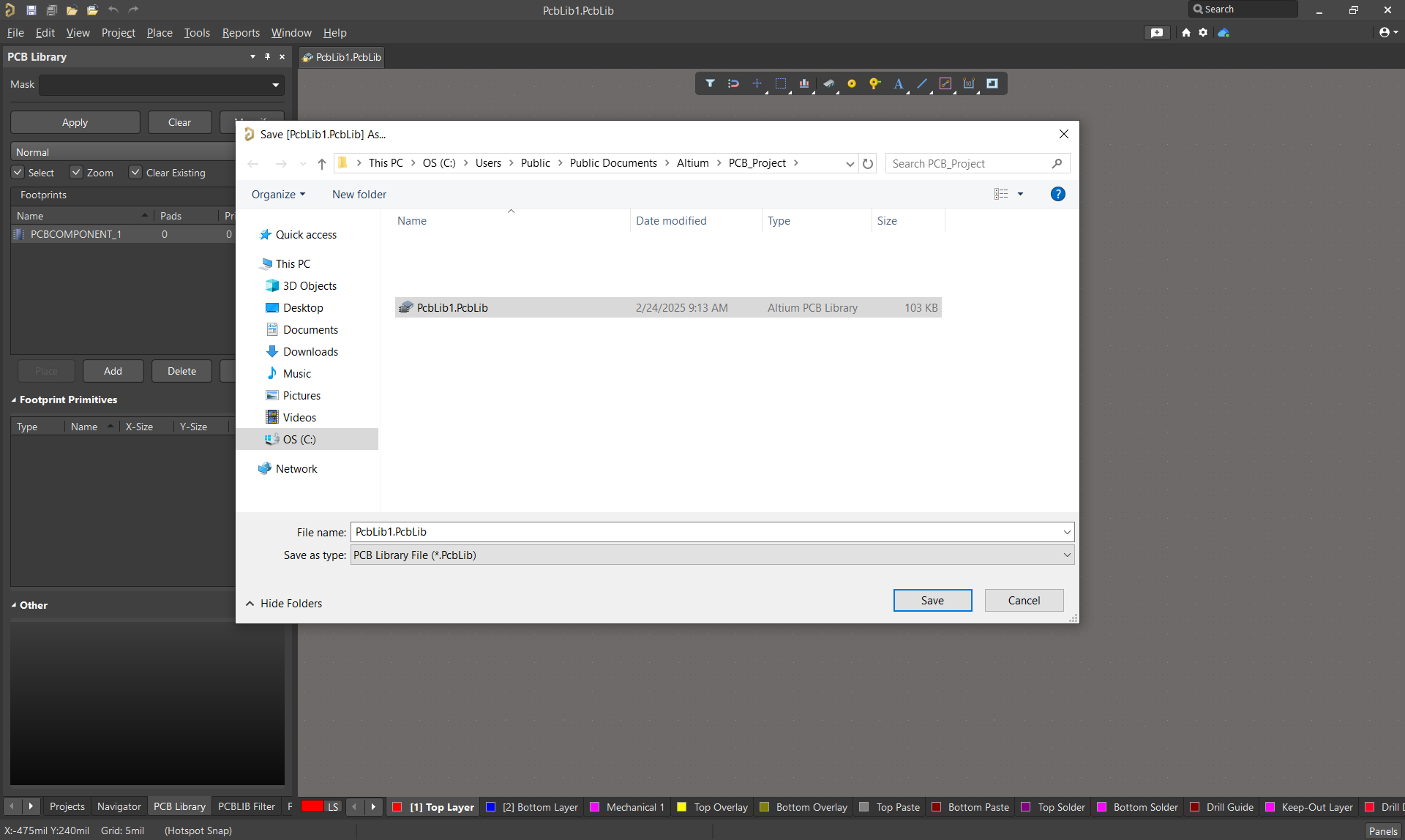 Then save the PCB Library (.PcbLib) somewhere on the PC.