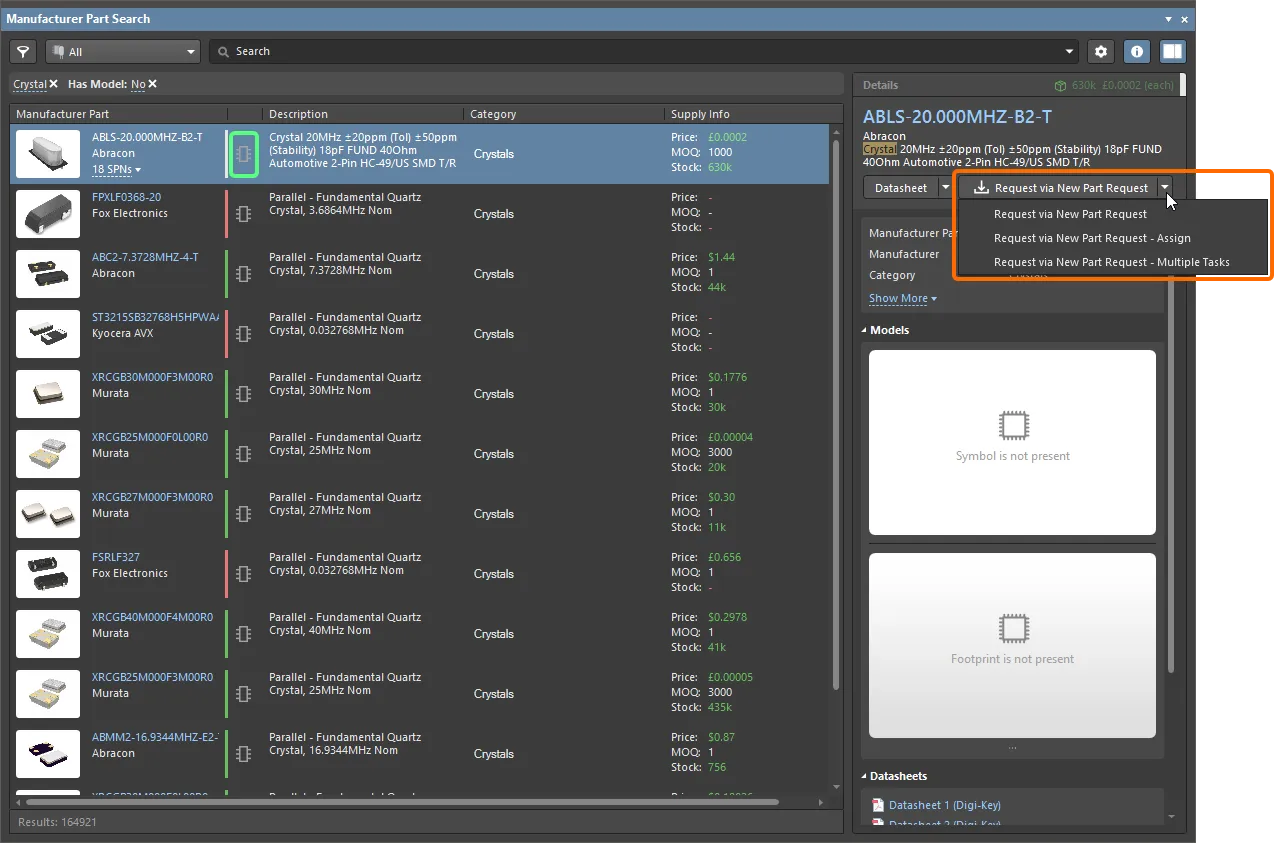 Requesting a part through the Manufacturer Part Search panel provides the added benefit that it will auto-fill key information for you, including all data sheets and parametric information.