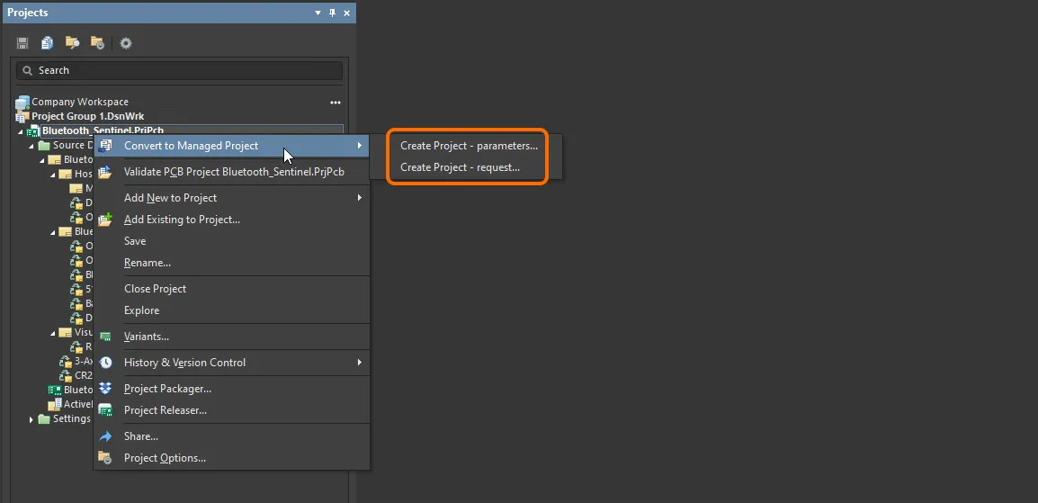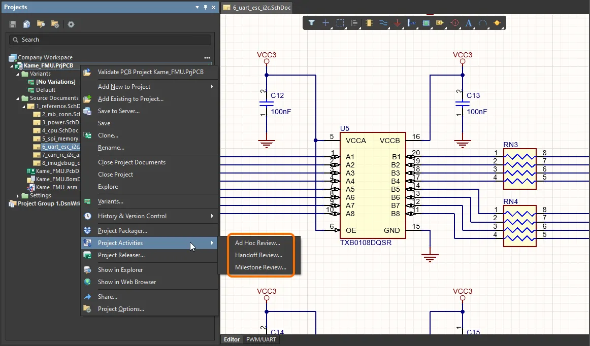 From within Altium Designer, activated design review and publishing process definitions – that are part of the Project Activities theme – can be accessed from the Project Activities context sub-menu, accessed by right-clicking on the entry for the design project in the Projects panel, or from the main Project » Project Activities menu.