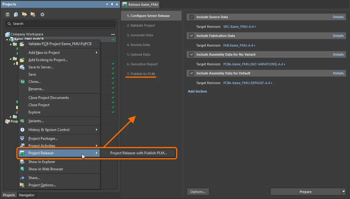 From within Altium Designer, the process for publishing to a PLM instance as part of the Project Releaser can be accessed from the Project » Project Releaser sub-menu for the active project, or by right-clicking on the entry for the design project in the Projects panel and choosing the process from the Project Releaser context menu entry.
