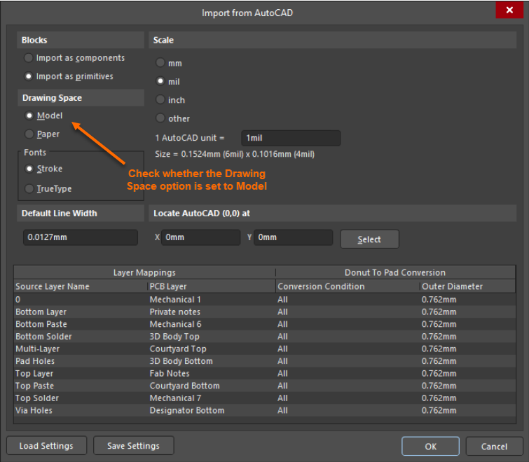 - Change the drawing space option from Paper to Model in the DXF import dialog.