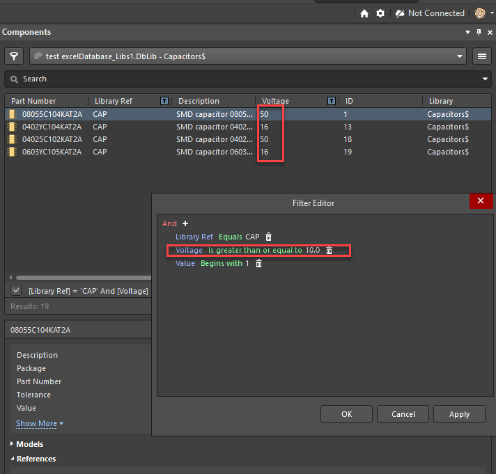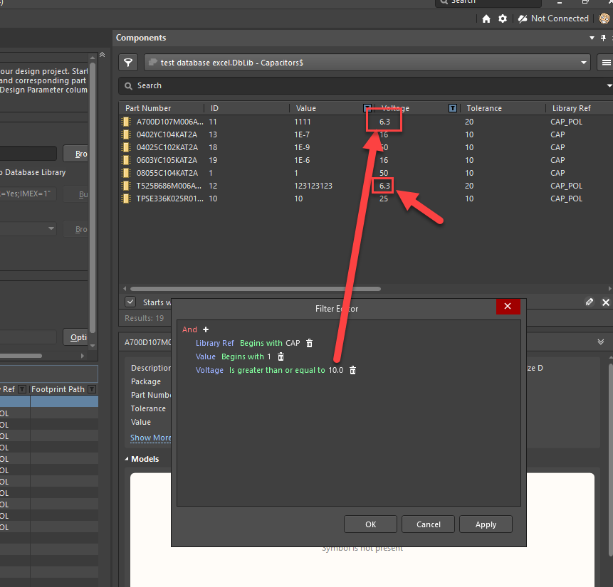 The Components Panel below is showing results from a DbLib configured to use an Excel XLS database. Notice the voltage values