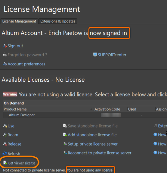 If you don't see the button for "Get License", either you already have a personal viewer license, or there is a viewer license in your organization's license pool (even if it is expired). You can have a Group Administrator for your organization use the company dashboard to remove allocations for any expired viewer licenses by following this Knowledge Base article: https://www.altium.com/documentation/knowledge-base/altium-designer/hide-old-expired-licenses or, you can install a version of AD between 20.0.10 and 23.7 to use the "Get Viewer License" control/link/button as described above. Versions 25.0.2 thru 25.7.1 have an advanced preference option to turn off the newer license management interface. With those versions, you can switch back to our older license management page by going to Preferences » System » General » Advanced button (lower right corner) » search for 2023 to quickly find the preference "System.LicenseManagement2023" » uncheck the box in the "Value" column, then restart Altium Designer. Then you can use the older "Get Viewer License" control. (Don't forget to switch back after you've got the viewer license.)