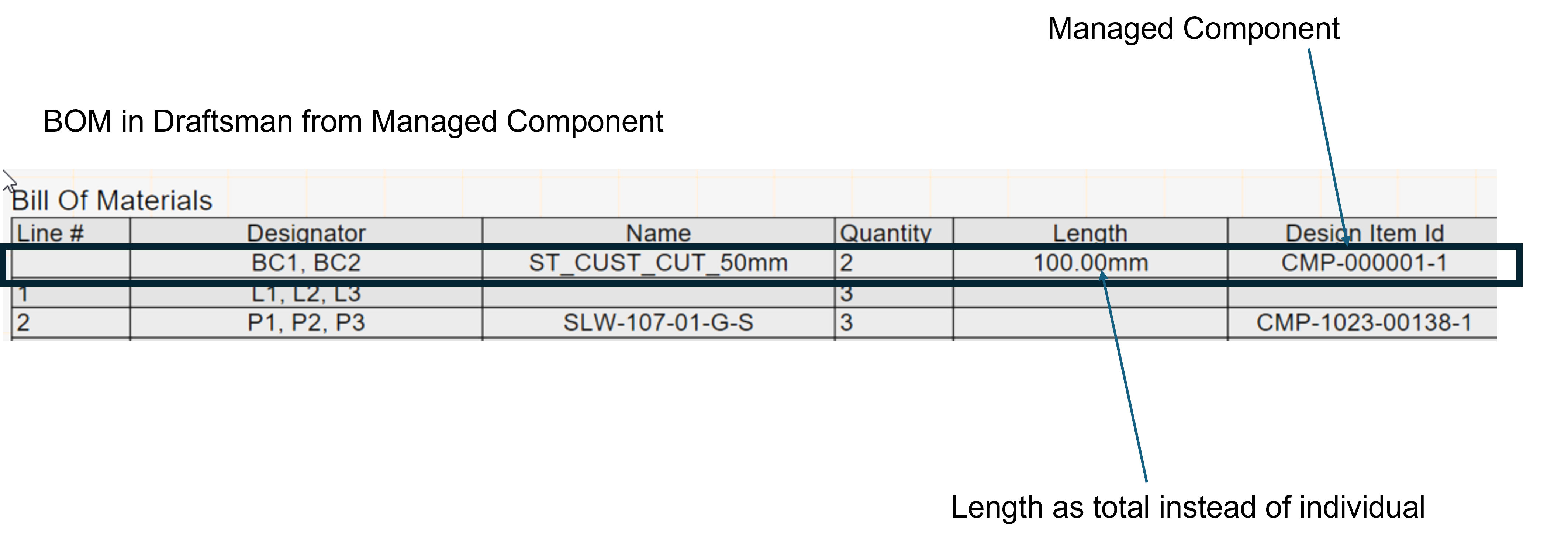 - The displayed length in the Draftsman BOM will reflect the total value defined in the