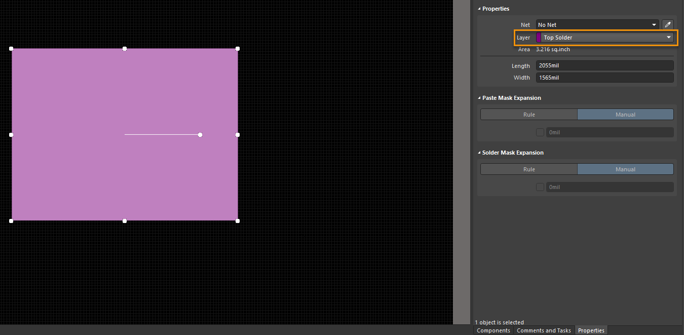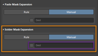 Most objects have a Soldermask Expansion property setting that you can manually assign a value, allowing you to create an opening around specific objects. To do this, select the object and then open the Properties Panel. Once open, there would be an option for Solder Mask Expansion that is set to Manual and disabled by default. To set a Value, select the Checkbox next to the entry and change the value from 0mil to any value you want for the Soldermask opening around that specific object.