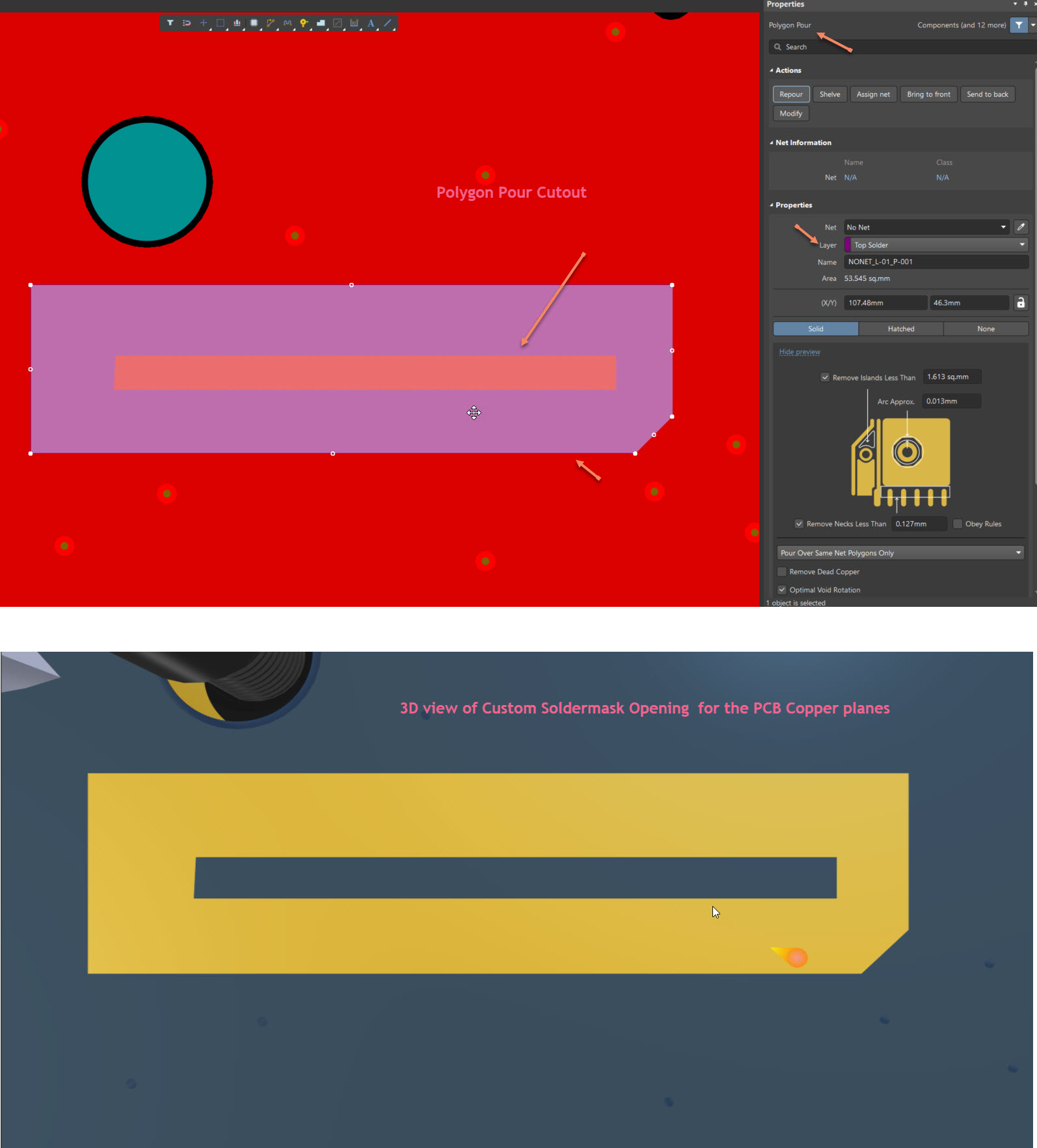 If we need some voids in the mask opening shape, we can use a polygon pour for the solder mask opening shape and a polygon pour cutout for the voids in it. This will help us achieve the custom solder mask opening with voids.