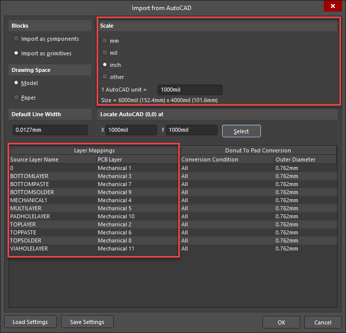 4. Mapped the layers of the drawing to a mechanical layer on the PCBDoc